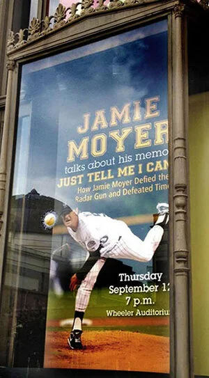 The addition of an inexpensive baseball prop on the exterior of this display window helped drive the message home. Pratt Library, Baltimore