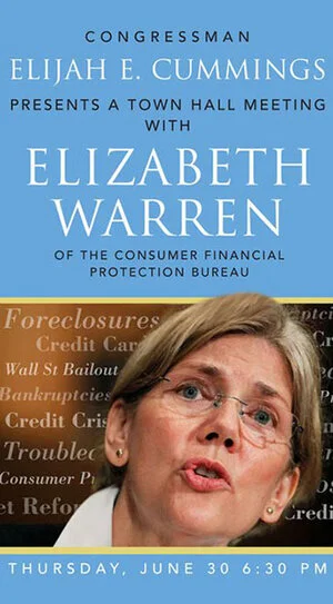 Even though I designed this window poster in 2011, three years after Elizabeth Warren had been appointed by President Obama to oversee the Troubled Asset Relief Program (TARP), for the background, I chose a color palette similar to the one used on Air Force One. Pratt Library, Baltimore