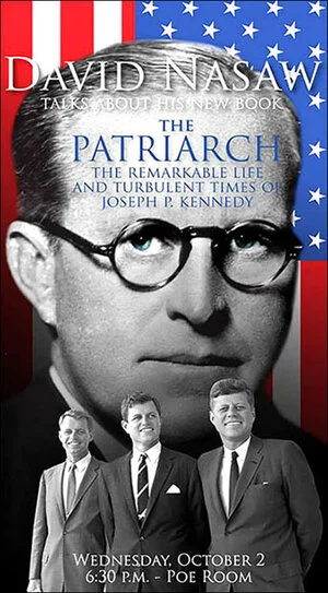 Joseph Kennedy played such an over-sized role in the lives of his children. To convey his patriarchy, I enlarged an image of him in the background that towers over his sons, and colored his eyes similar to the color blue in the U.S. flag. Pratt Library, Baltimore